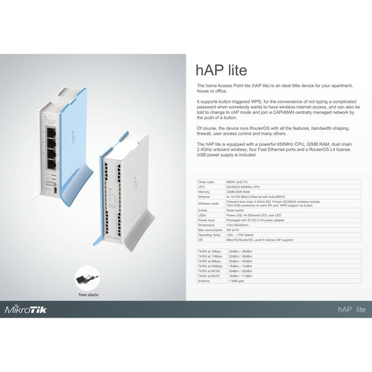 MikroTik hAP Lite 4 Port Ethernet 300Mbps WiFi 4 Router | RB941-2nD