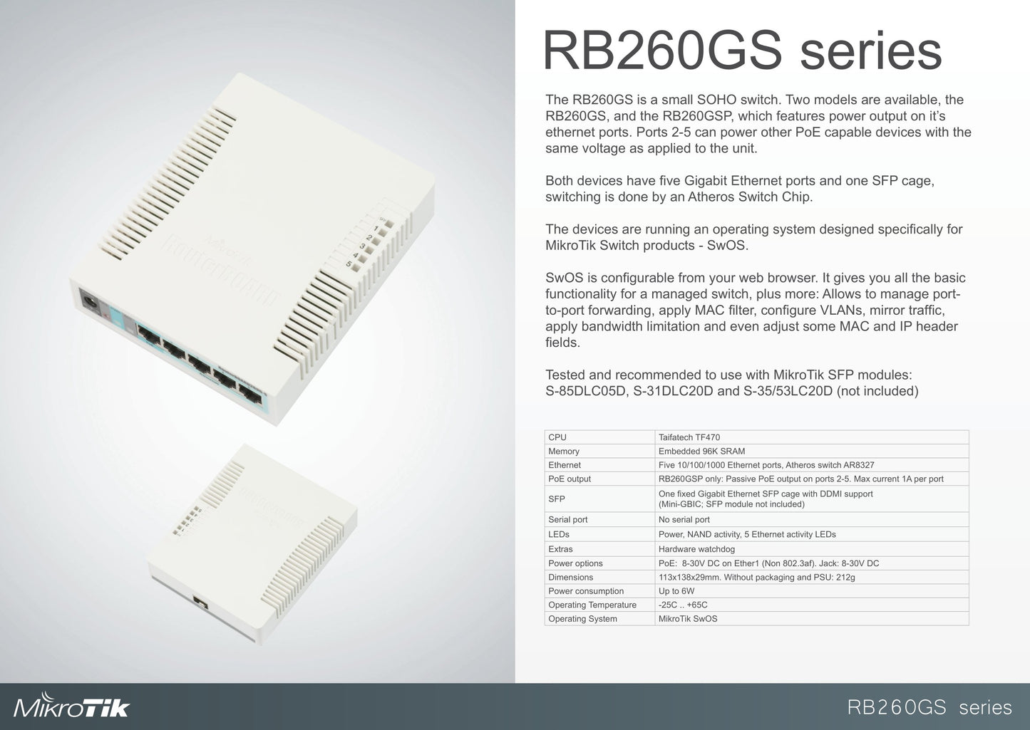 MikroTik's RB-260GSP is SwOS smart switch featuring 5x Gigabit Ethernet ports, 1x 1.25Gbps SFP Port and PoE passthrough on ports 2 to 5.